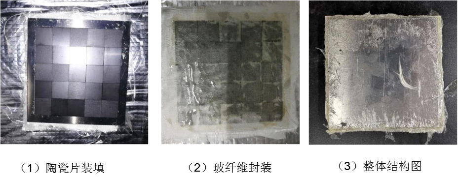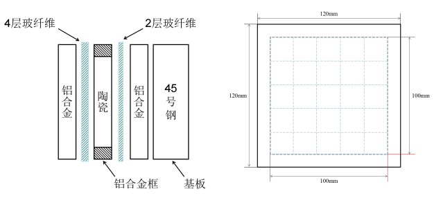 靶板從左到右依次為鋁合金面板、4層玻纖布、鋁合金邊框及陶瓷片、2層玻纖布、鋁合金背板、45號鋼基板。采用鋁合金邊框對陶瓷塊進行二維約束,再將玻纖布平鋪在陶瓷層的正面和背面(正面鋪上四層玻纖布、背面鋪上兩層玻纖布),正面與背面再用鋁合金板密封,使用聚氨酯膠黏劑將整個結構在常溫下固化成型為復合裝甲陶瓷結構件。