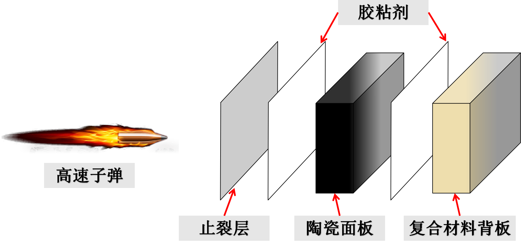 大多數(shù)復(fù)合陶瓷裝甲都是采用結(jié)構(gòu)陶瓷靶面+金屬/非金屬背靶結(jié)構(gòu),如下圖所示:
