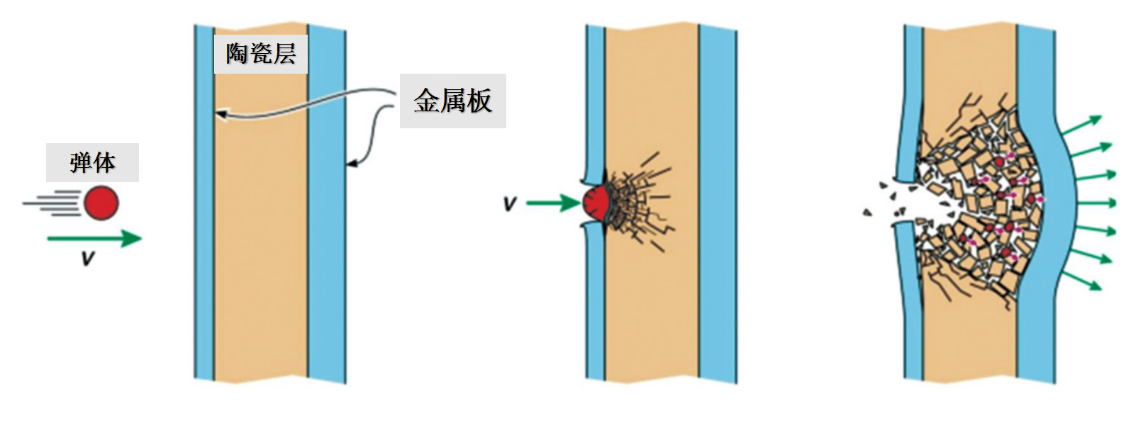 陶瓷層扮演著兩方面的作用:(1)使彈體減速的同時(shí)也令彈體變形或碎裂;(2)將彈體的沖擊力分散到一個(gè)較大的區(qū)域,使金屬背板能產(chǎn)生利于吸能的大變形,避免其在局部被直接穿透。