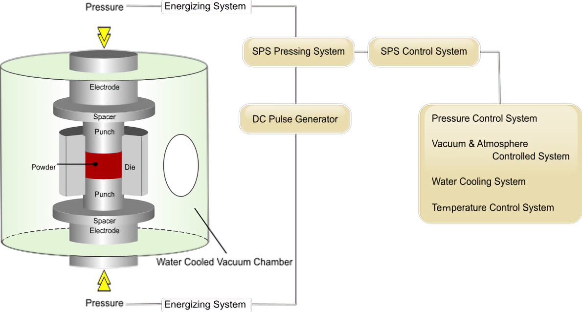 該技術(shù)是在加壓粉體粒子間直接通入脈沖電流,由火花放電瞬間產(chǎn)生的等離子體進(jìn)行加熱,利用場(chǎng)效應(yīng)、熱效應(yīng)等在低溫下進(jìn)行短時(shí)間燒結(jié)的新技術(shù)。SPS采用的是直流脈沖電流通電加壓燒結(jié)的方法,通過控制電流大小、脈沖的占空比、氣氛、壓頭的壓力、行程等參數(shù)來對(duì)工藝進(jìn)行控制。